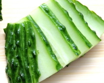 三、把黄瓜切成薄片,可临睡前贴在脸上,第二天早晨去掉,你会发现皮肤比昨日光滑、润泽多了。