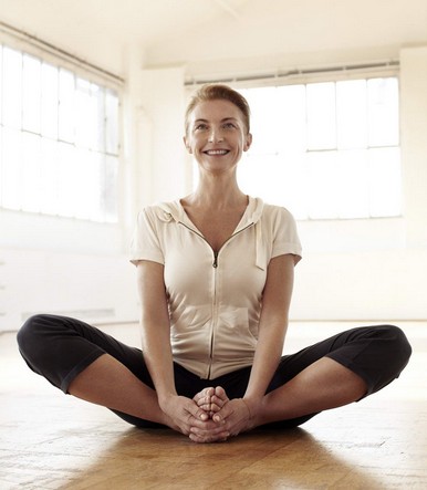 1、躺于瑜伽垫上,两手分别自轻触两耳朵,弯曲双脚停在空中。